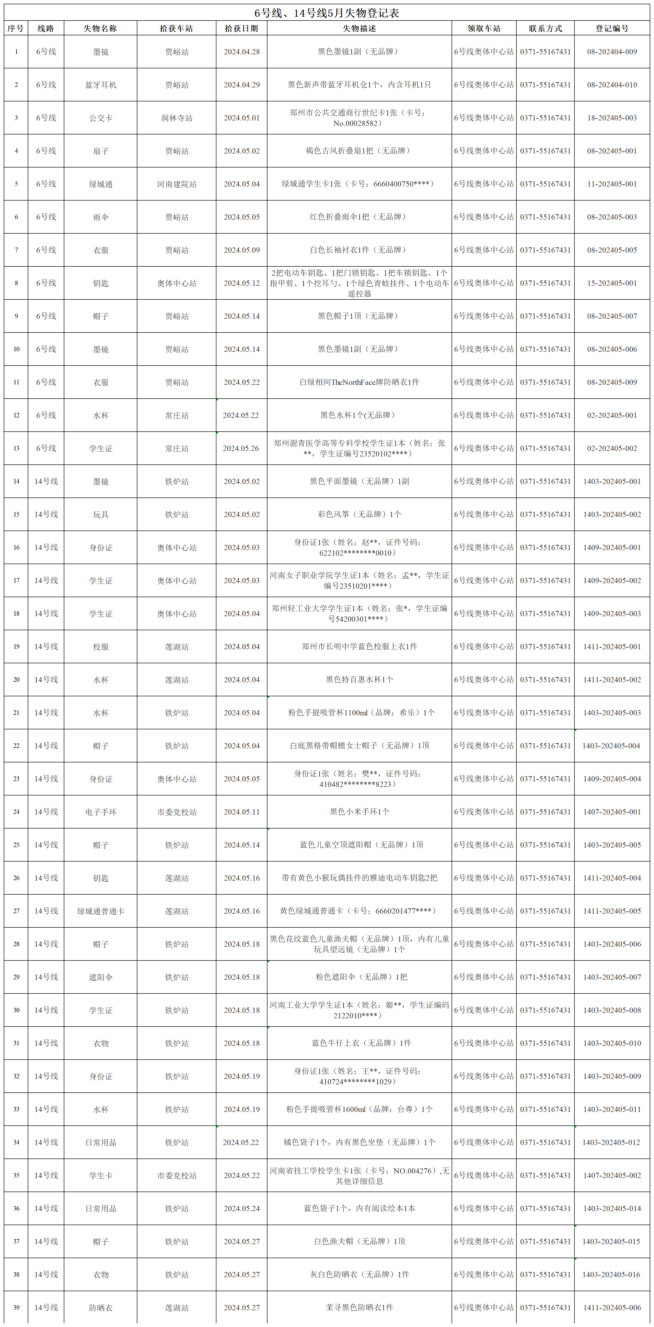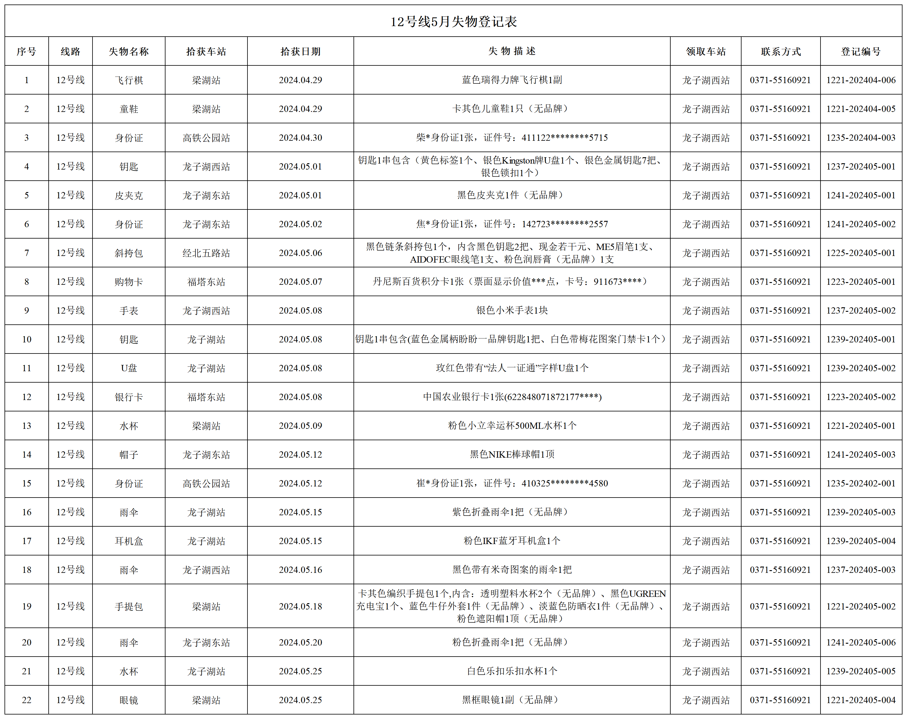 2024年4月28日—2024年5月28日车站无人认领失物情况